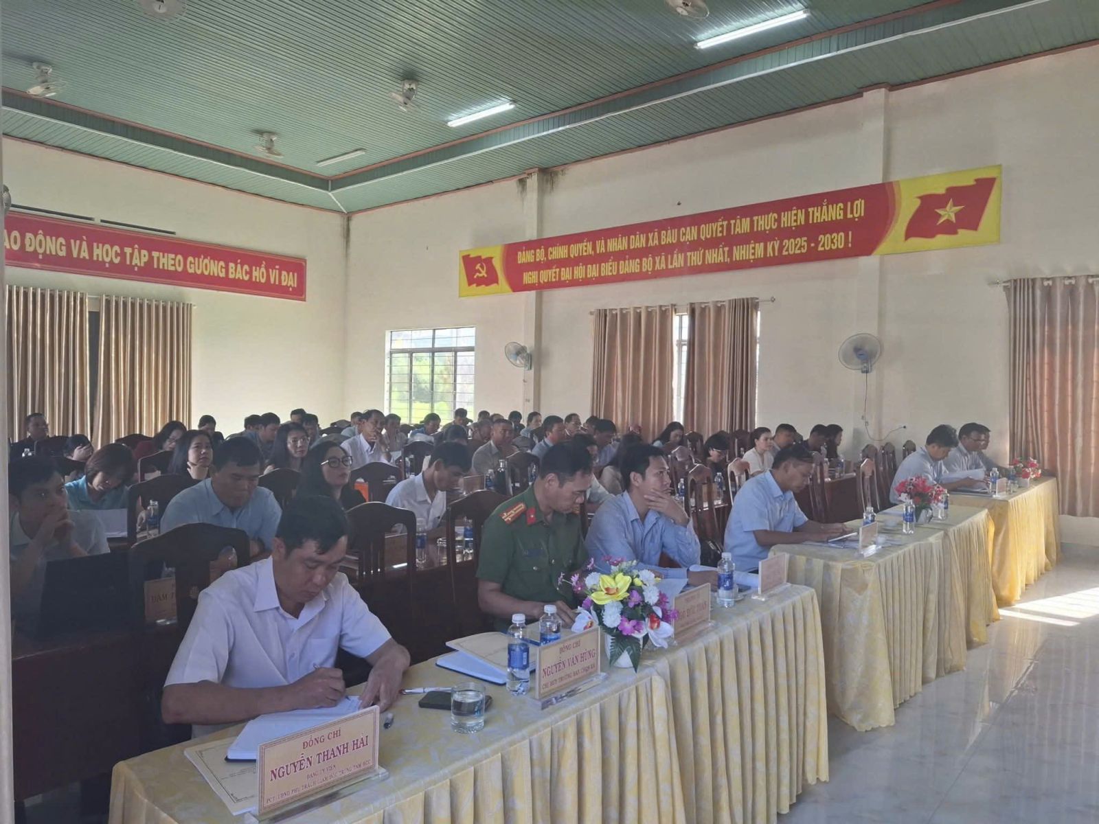 Đồng chủ trì Hội nghị: Đ/c Trần Trung Hiếu - Bí Thư Đảng uỷ, Chủ tịch HĐND xã; Đ/c Siu H'Thoan - Phó Bí thư Thường trực Đảng uỷ; Đ/c Nguyễn Quang Trung - Phó Bí thư Đảng uỷ, Chủ tịch UBND xã.