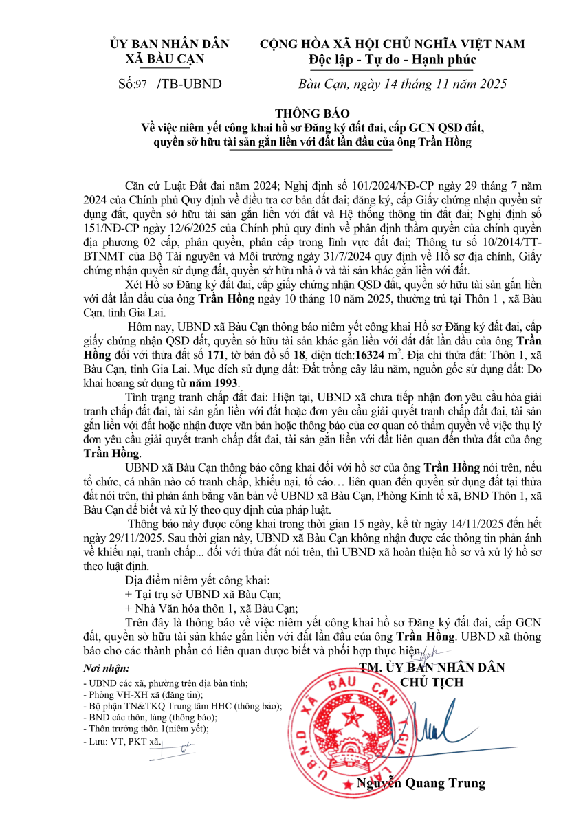 NGÀY 14 THÁNG 11 NĂM 2025, UBND XÃ BAN HÀNH THÔNG BÁO SỐ 97/TB-UBND VỀ VIỆC NIÊM YẾT CÔNG KHAI HỒ SƠ ĐĂNG KÝ ĐẮT ĐAI, CẤP GIẤY CHỨNG NHẬN QUYỀN SỬ DỤNG ĐẤT, QUYỀN SỞ HỮU TÀI SẢN GẮN LIỀN VỚI ĐẤT LẦN ĐẦU CỦA ÔNG TRẦN HỒNG