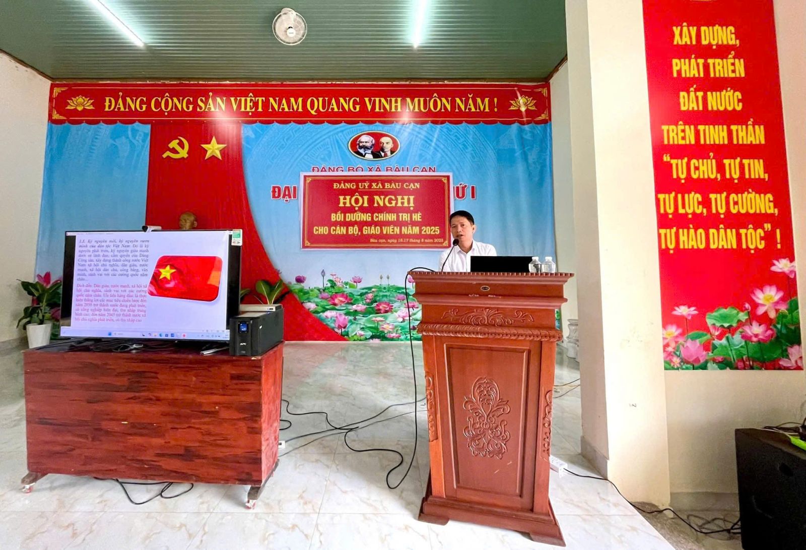 Đồng chí Trần Trung Hiếu – Bí thư Đảng ủy xã Bàu Cạn trực tiếp giảng bài và truyền đạt các nội dung trọng tâm. Trong chương trình, các đại biểu được nghe quán triệt những nội dung cơ bản của các nghị quyết, chỉ thị mới của Đảng, Nhà nước; thông tin về tình hình thời sự quốc tế, trong nước và địa phương; phương hướng, nhiệm vụ năm học 2025 – 2026, đặc biệt là yêu cầu đổi mới căn bản, toàn diện giáo dục và đào tạo.